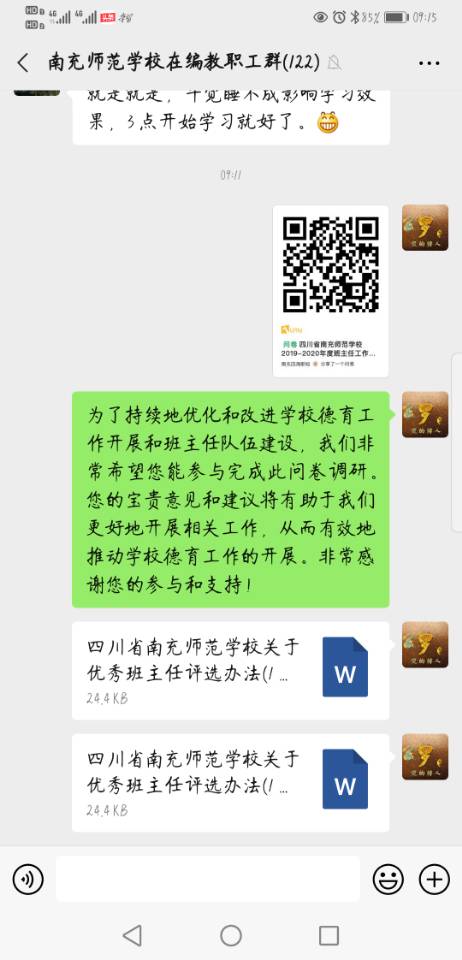 前期政教处把《四川省南充师范学校班主任评优办法》和《四川省南充师范学校班主任工作管理规定》两个制度的意见稿发到南师教学群和班主任群,通过问卷调查的方式,充分收集全校教职工的意见。本次会议结合全校教职工提出的建议,不断完善两个制度,使制度更公平公正,更具人性化和科学性。