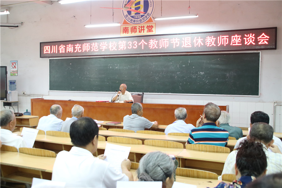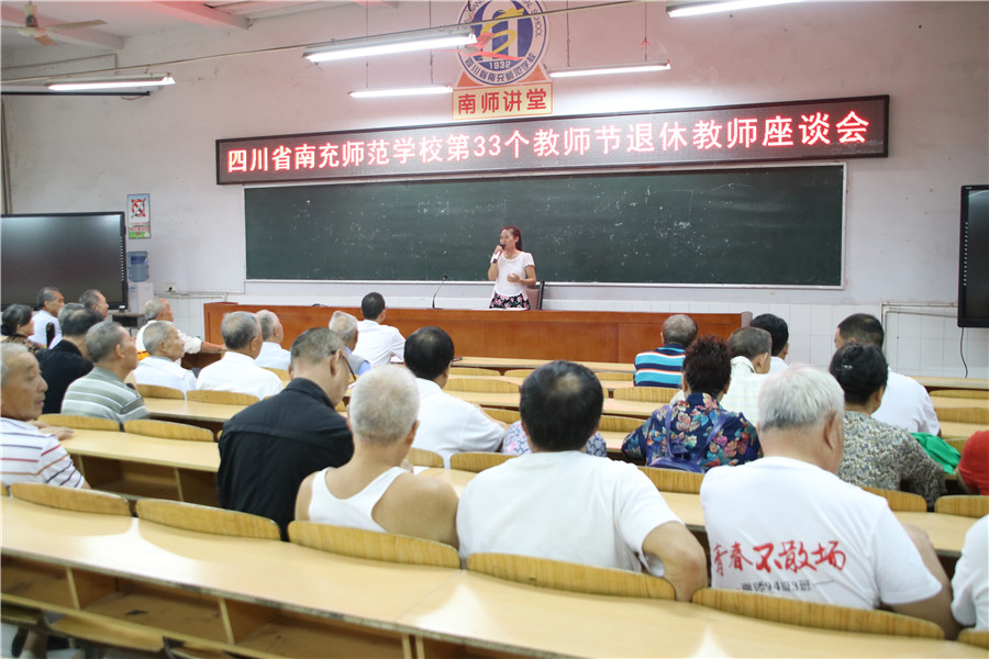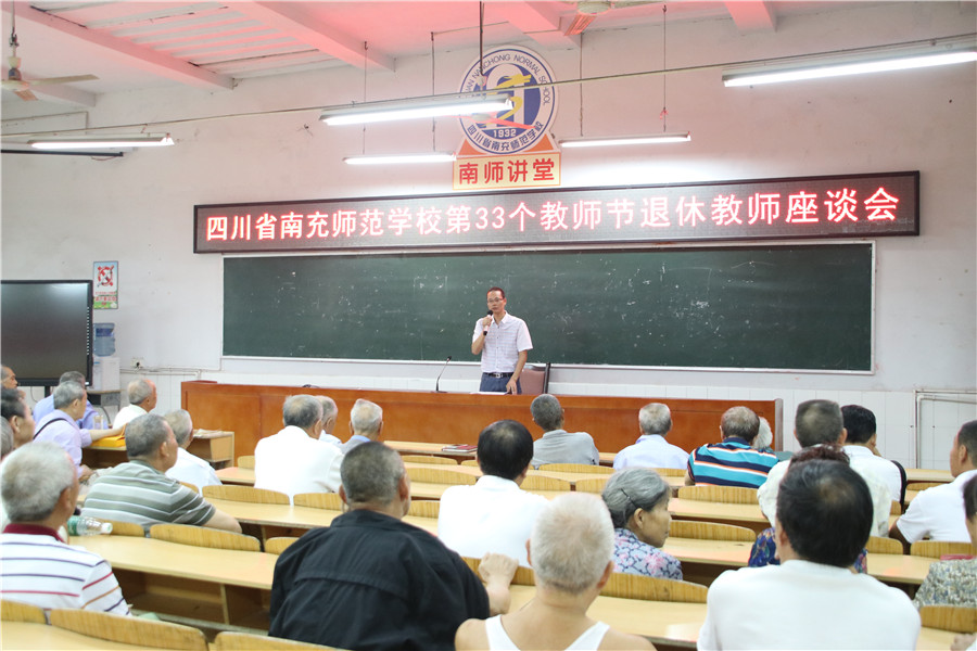 9月8日,南充师范学校职教楼学术厅热情洋溢,全体退休教师欢聚一堂,开展第33个教师节座谈会。党办主任万彩霞、行政办主任伍银峰以及其他部分处室干部参加活动。