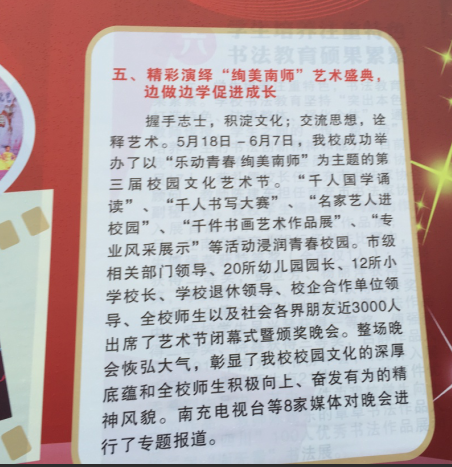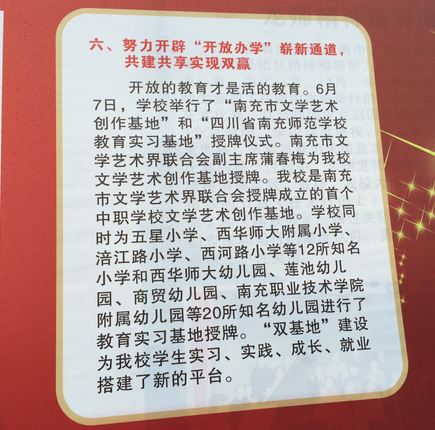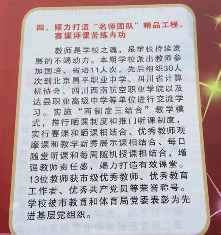 开学典礼上,学校党委、行政,向莅临开学典礼的各位领导和嘉宾表示衷心的感谢;向6名新老师表示热烈的欢迎;向全体教职工表示节日的祝贺!过去的一学期,全体南师人精诚团结,艰苦奋斗,硕果累累。学校成功举办了以“乐动青春·绚美南师”为主题的第三届校园文化艺术节,丰富了校园文化,锻炼了学生,培养了教师,影响深远。在第十二届全国中等职业学校“文明风采”大赛中,我校原创舞蹈节目《请抬起你的头》荣获四川省舞蹈类唯一一个全国一等奖,《蚂蚁丁丁》荣获全国优秀奖。14幅师生篆刻作品入选四川省第六届篆刻艺术作品展,入展作品占四川省十分之一,居全省第一。13位教师获市级表彰,2013级30名同学成功考取成都师范学院免费师范生。