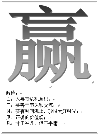 《理想信念》是学校党委书记、校长蔡礼儒为全体新生精心准备的入学教育第一课。蔡校长以对一个“赢”字的解读,引导全体新生规划学习、规划人生,以“赢”得人生的成功为奋斗目标,以怎样“赢”得成功为路径,以“赢”得成功的人生为落脚点,把整个学习生涯乃至未来的职业生涯都浓缩在这个写起来容易做起来很难的“赢”字里。在讲到怎样“赢”得成功时,他还强调,一定要走“上――止――正”的路线,上:努力上进,止:有约束的成长,正:身端品正,最终把自己培养成一个合格的、有用的人才。全场师生对蔡校长独具匠心的讲解啧啧称赞。