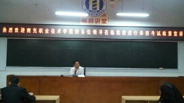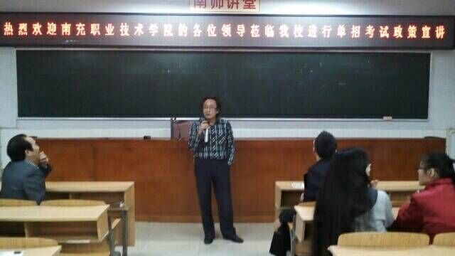 我校许多中专班的学子们学习刻苦、成绩优秀,他们有一个想让自己飞得更高飞得更远的梦想,希望有机会进一步提升自己的学历。为了给广大同学创造一个提升学历的机会,我校特与南充职业技术学院取得联系。姚院长一行亲临我校,专门就单招考试对象,考试范围,考试环节,考试策略等,对我校广大学子进行了讲解.通过此次宣讲,让我校同学明白了单招考试的意义,增强了参考的信心,引起了同学们的共鸣,效果良好。