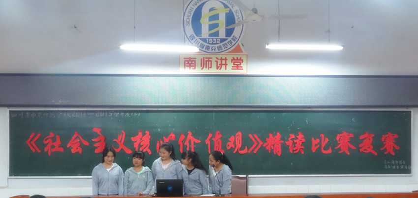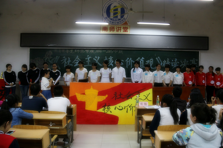 为号召南师学子争做“爱国、敬业、诚信、友善”的好公民,纪念“五四”爱国运动96周年,南师团委宣传部于2015年5月4日下午6:30分在职教楼学术厅开展了“社会主义核心价值观”的精读比赛——决赛活动。