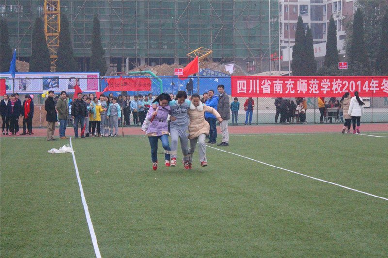 阴沉的天气掩不住同学们心中燃烧的熊熊斗志,这是运动员们在参加“三人四足”趣味体育比赛项目,只听得加油声、喝彩声、欢笑声此起彼伏!比赛需要三人一组并排,中间一位的双踝要与左右同学相邻的脚踝绑在一起,然后齐驱跑步接力。高难度的团队协作项目没有难倒我们的参赛队员,虽然绑住了脚踝,但也绑住了人心,在全体师生的注目下,他们凝神聚力,飞奔在跑道上,把“三人四足”的趣味体现得淋漓尽致。