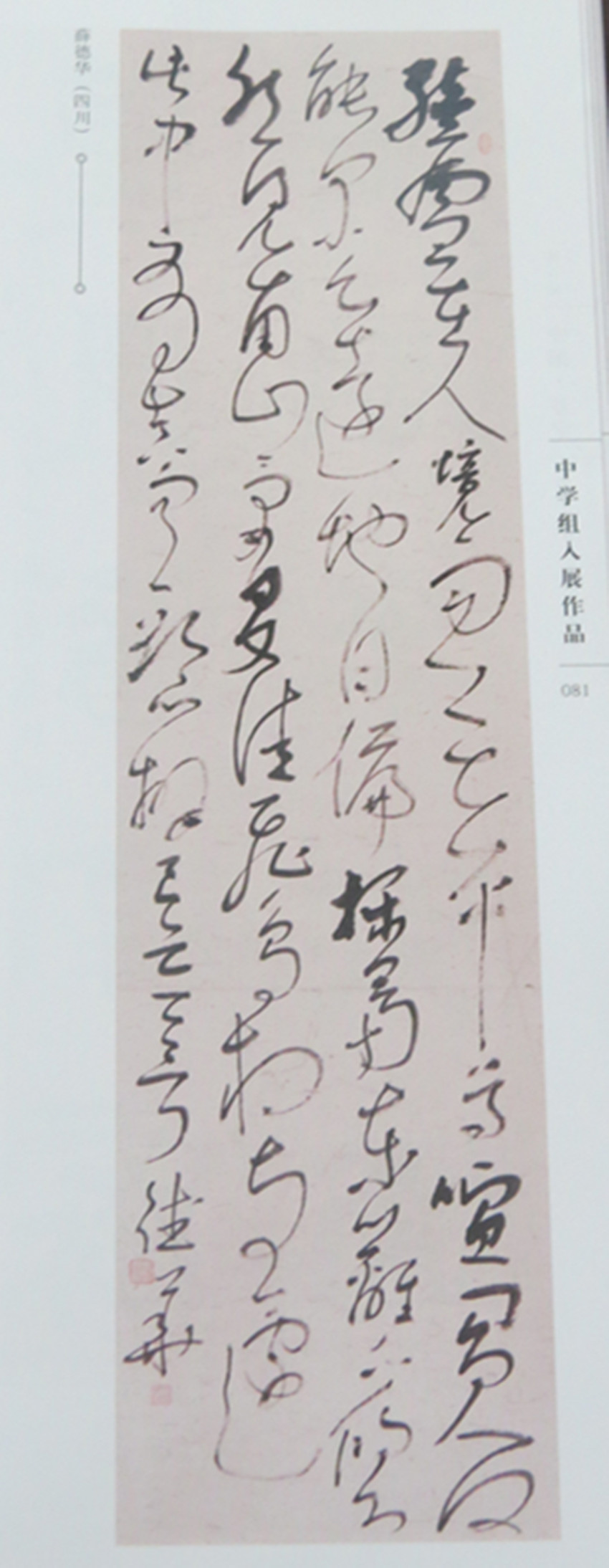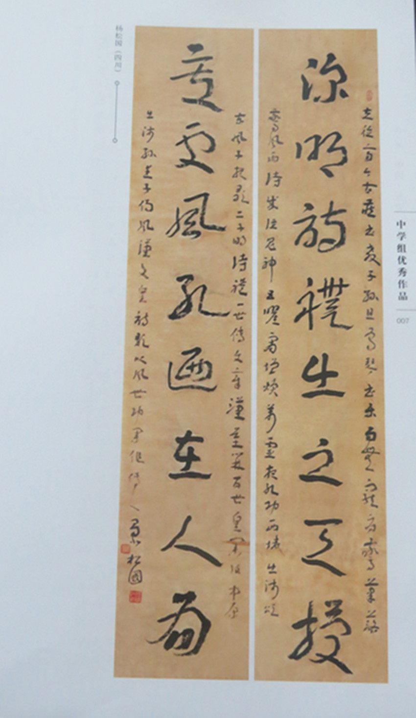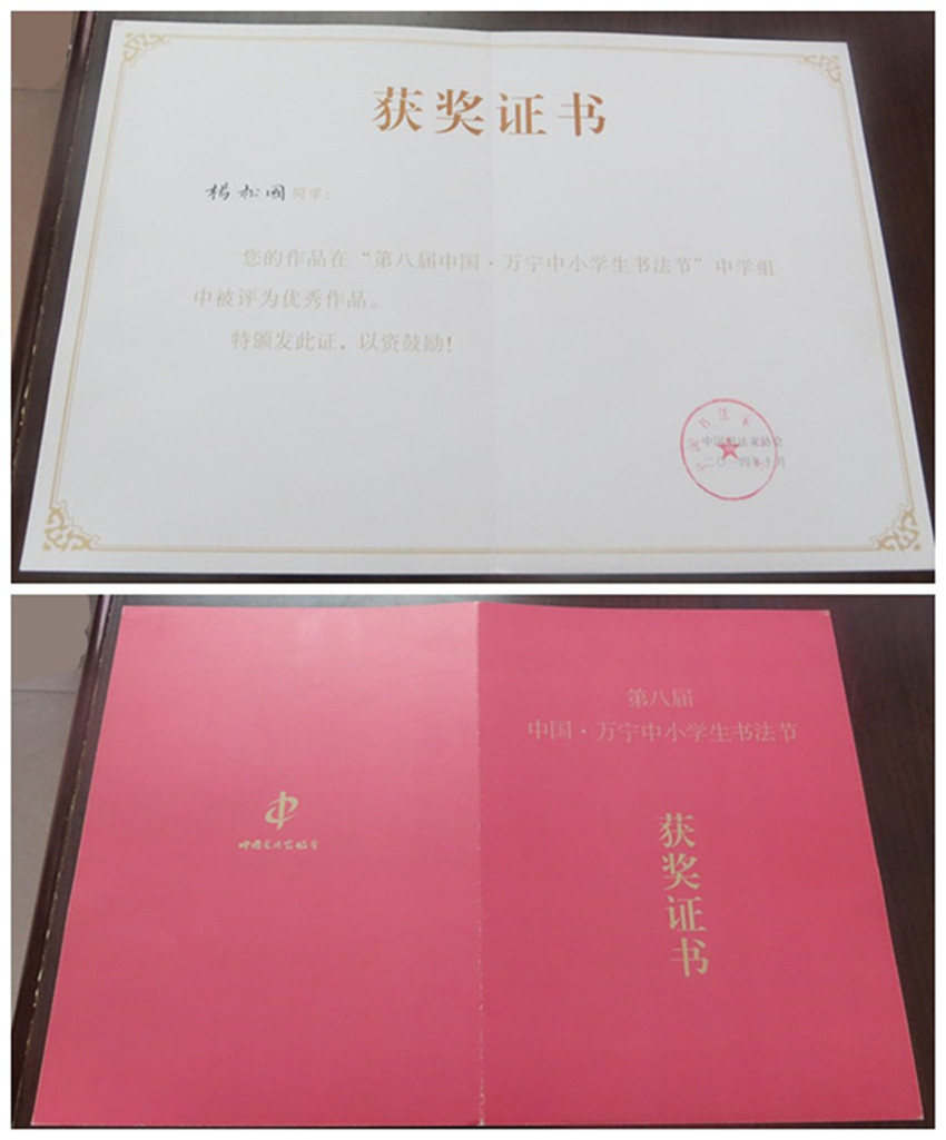 经过全国书法名家数月仔细、认真的评选,我校2010级学生杨松国在全国中学组3173件参赛作品中脱颖而出,其作品得到了全国知名艺术家龙开胜的高度评价。组委会于2014年5月对其获奖作者进行现场测试,杨松国同学的草书作品得到了评委的一致认可,被评委优秀作品(最高奖),并应邀参加中日艺术交流,其中罗永君、蒋琼、薛德华、白吉林被评为入展作品,以上作品于2014年10月在海南万宁市成功展出。