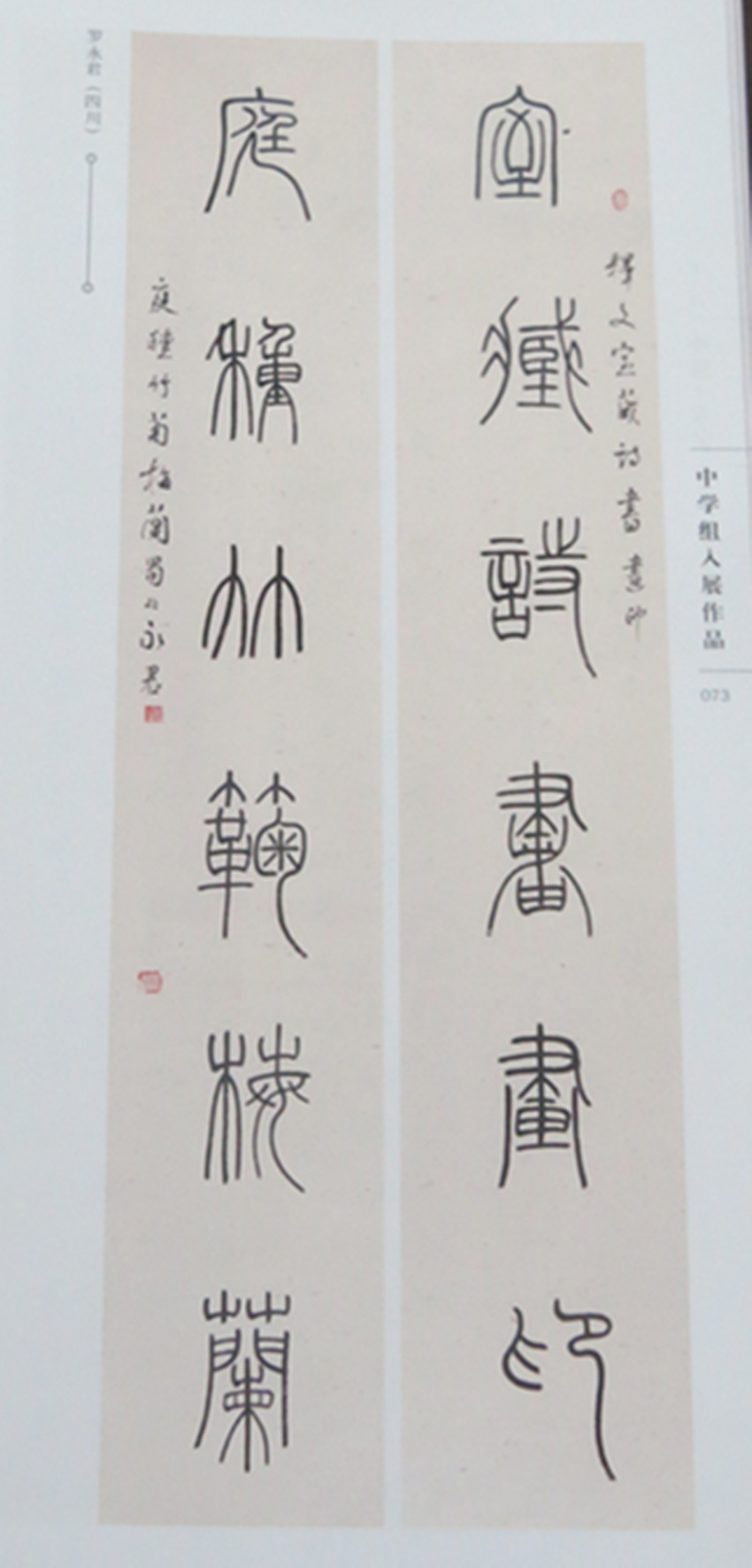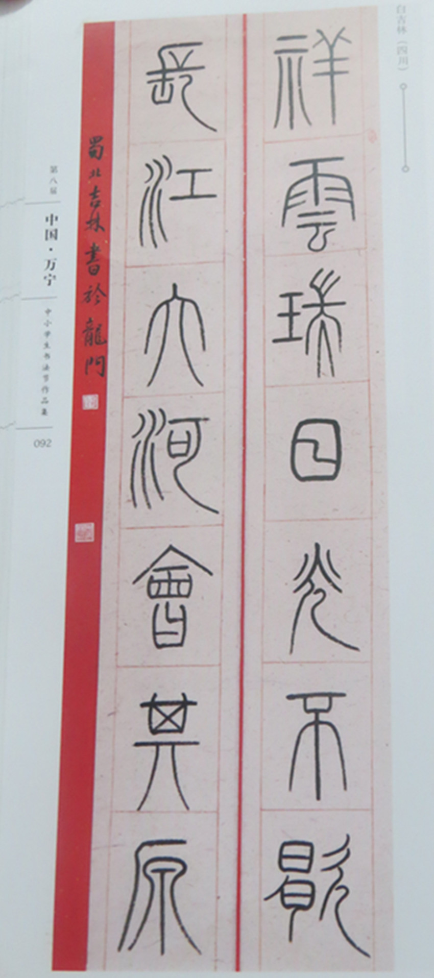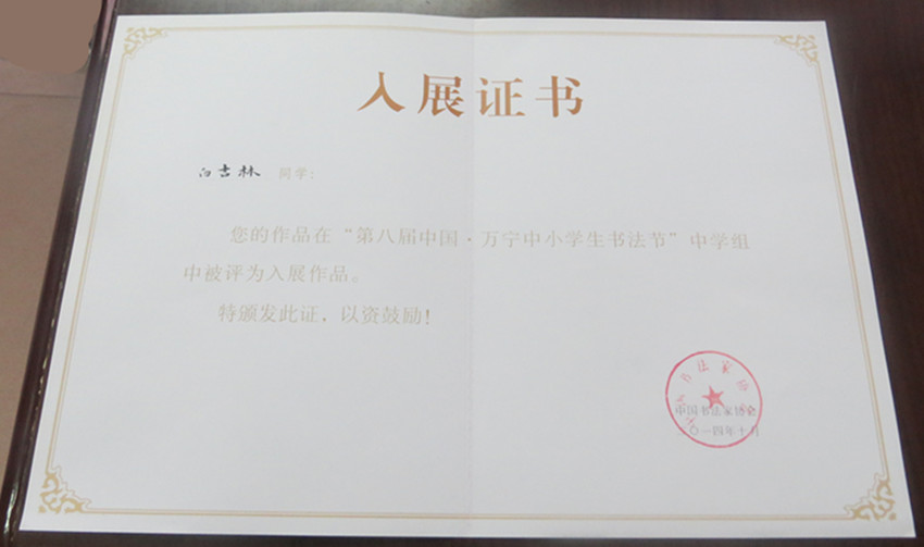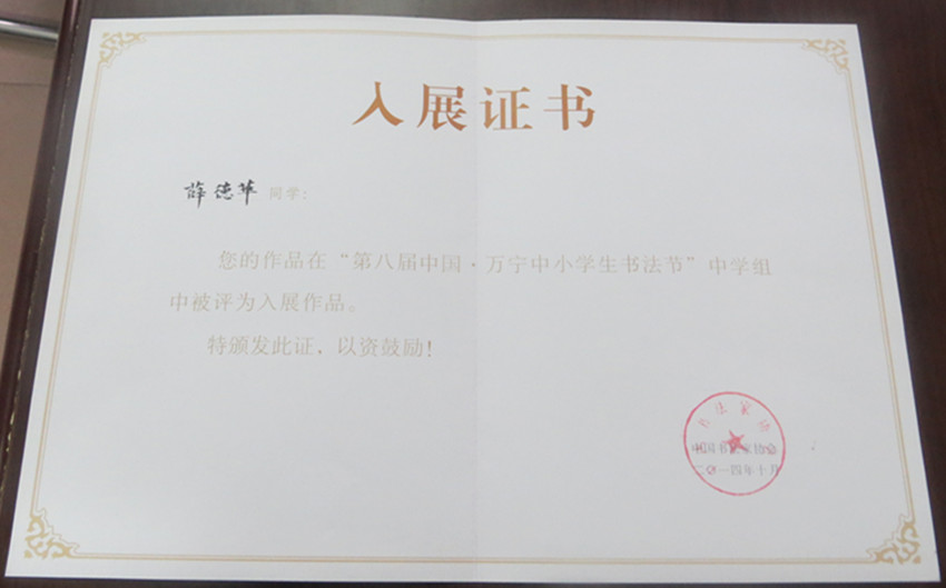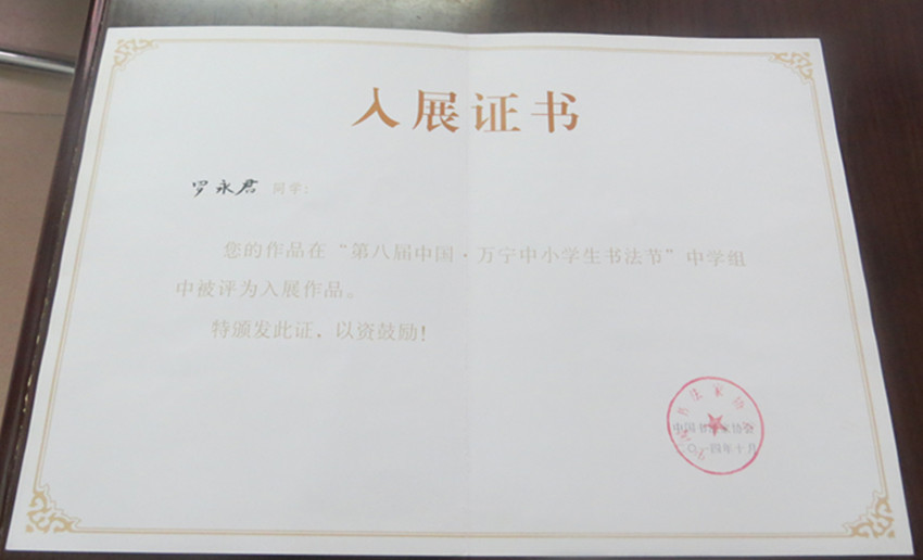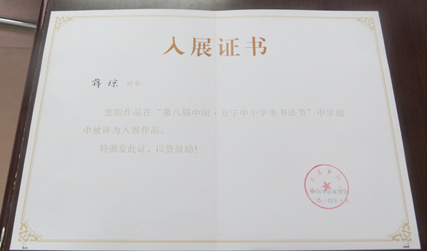 由中国书法家协会主办的全国“第八届万宁”中小学生书法大赛自2013年4月征稿之日起,我校领导高度重视,委派书法教师陈建东负责组织本次参赛训练。在集中专项训练长达1个月的时间后精选作品10余件,其中包括篆、隶、楷、行、草不同书法风格,在学校的推荐下,报送大赛组委会。