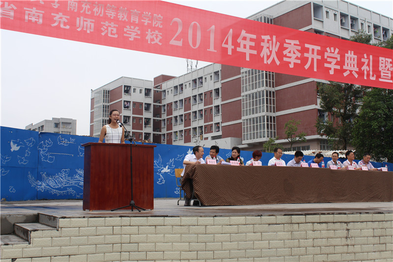 2014年9月10日上午九时,南充师范学校2014年秋季开学典礼暨表彰大会在学校运动场隆重举行。西华师范大学副校长彭正松教授、西华师范大学教务处处长冯明义教授、南充市教育局副局长邓晓皋、南充市教育局职成科科长曹萍等领导莅临指导,我校全体党政干部和师生参加了开学典礼。本次开学典礼主要有五项内容:举行升旗仪式、领导讲话、李长江副校长宣读2013—2014学年度先进集体和先进个人文件并现场颁奖、政教处主任王勇宣读校园十佳学生及先进班集体文件并现场颁奖、青年教师代表和学生代表发言。