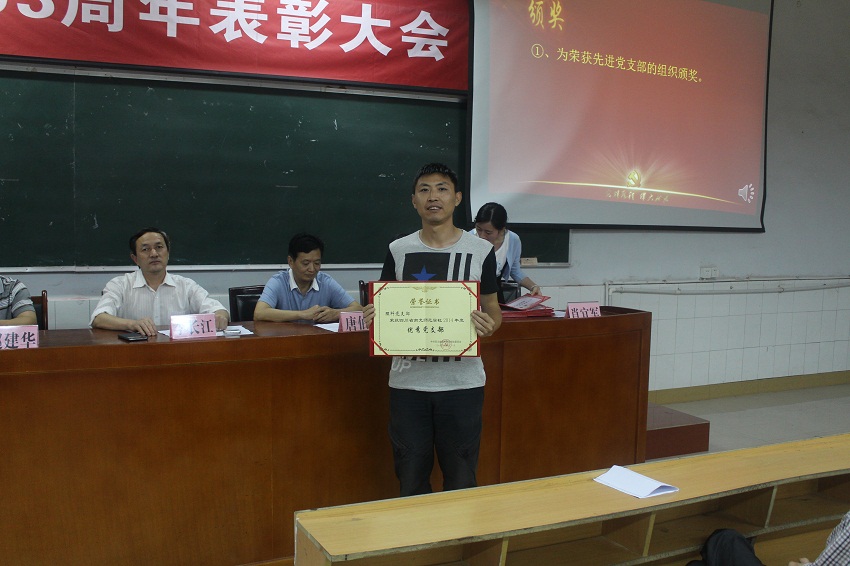 大会第四项,李长江校长宣读”七一”表彰决定。为了进一步树立典型、弘扬正气,学校党委决定授予理科支部先进党支部称号,授予冯颖茜、张潇两位同志优秀党务工作者称号,授予赵建华同志优秀盟务工作者称号,授予王春等12位同志优秀共产党员称号,授予武温艳等3位同志民主党派先进个人称号。学校党委领导和各支部书记为获奖人员现场颁奖并合影留念。