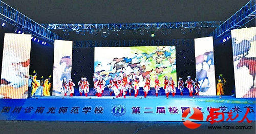 掌声雷动,青春激荡,南充师范校沉浸在欢乐的海洋中!6月12日晚,近4000名师生相约该校第二届校园文化艺术节颁奖晚会现场,数百名师生代表在简单而宽大的舞台上欢歌劲舞,施展才艺,把最具人文特色的一面呈现出来。
