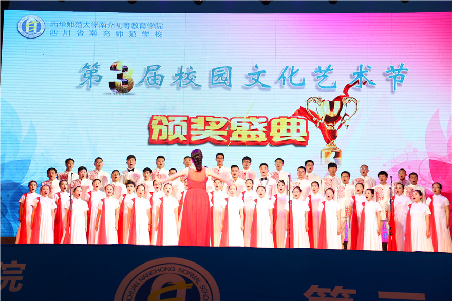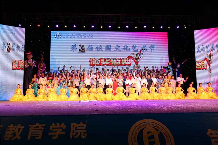 欢聚的日子里,热情似火,繁花醉人;梦想的季节中,温情如水,壮志高歌。相约圣贤,握手志士,积淀文化底蕴;交流高尚,碰撞智慧,诠释艺术内涵。为打造“男生儒雅、女生优雅、校园高雅”的三雅校园,提升学生核心素养,西华师范大学南充初等教育学院、四川省南充师范学校第三届校园文化艺术节闭幕式暨颁奖晚会于2016年6月7日19:30在学校运动场成功举行。市级相关部门领导、20所幼儿园园长、12所小学校长、学校退休领导、校企合作单位领导、全校师生以及社会各界朋友出席了本次晚会。南充电视台、南充日报 、南充晚报、华西都市报、中国新闻网、四川经济日报、四川经济网等多家媒体对晚会进行了报道。