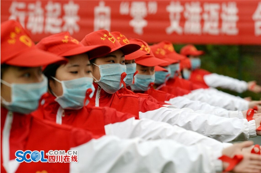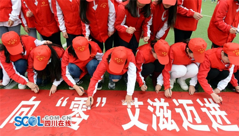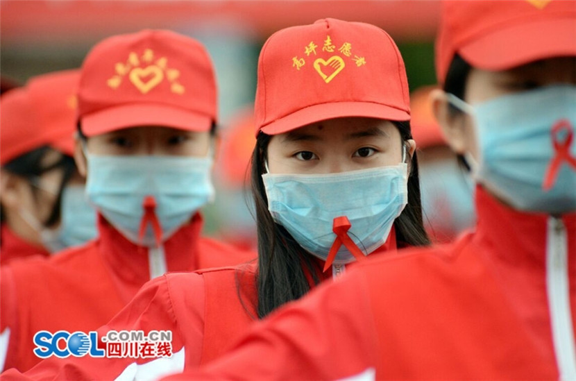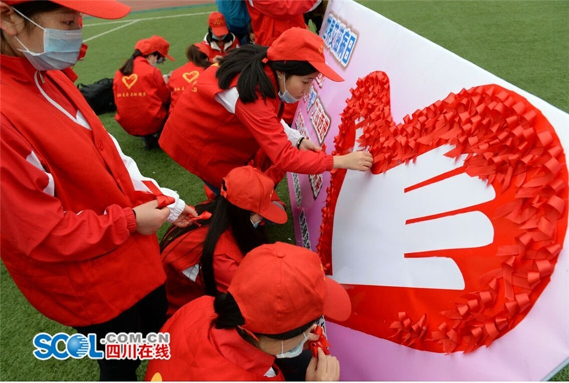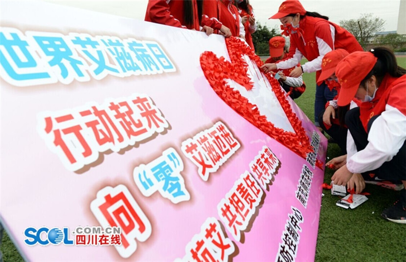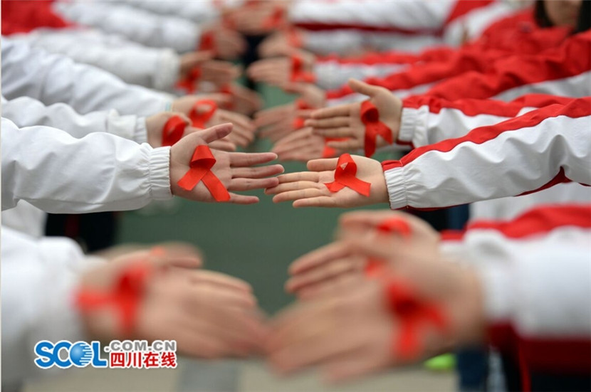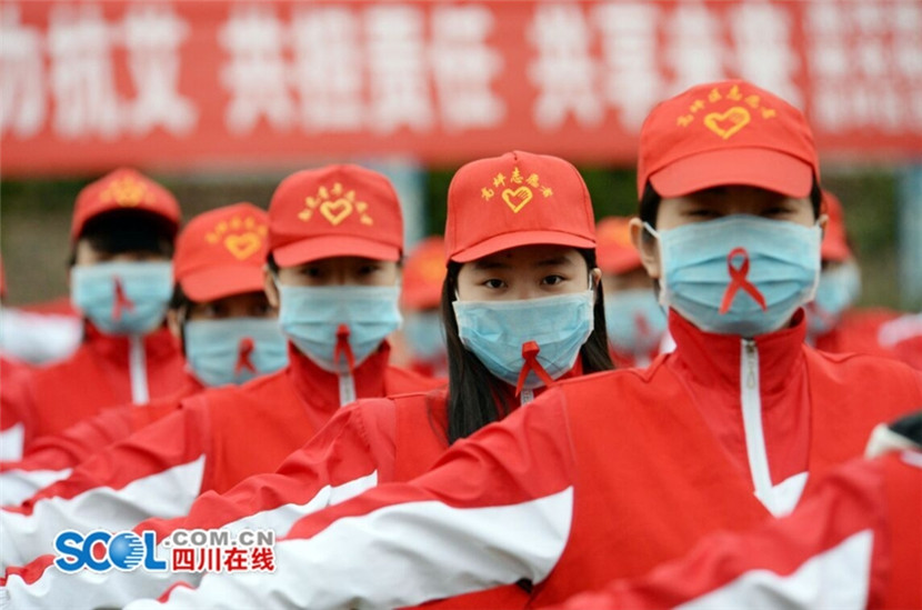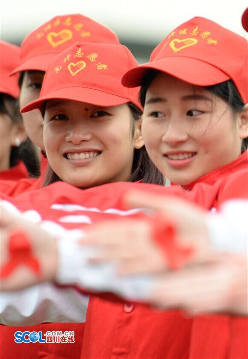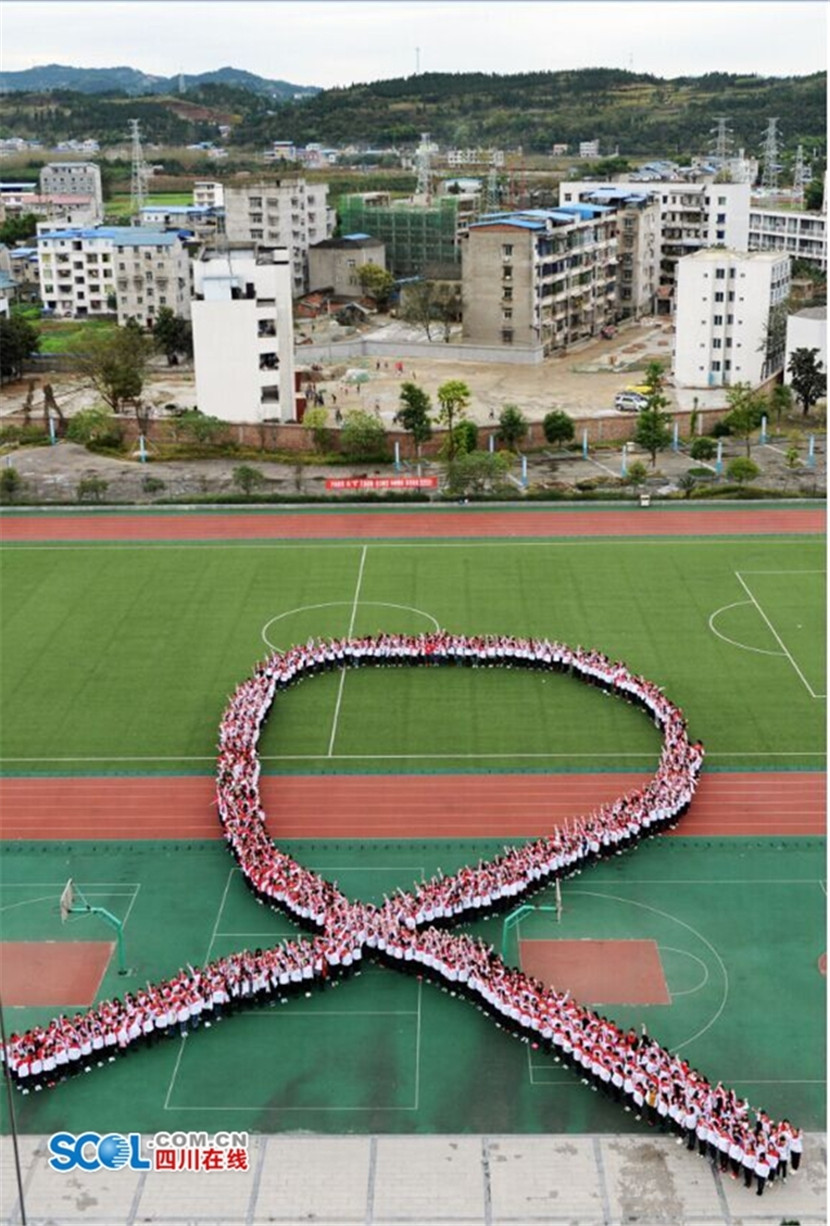 南充师范学校的1000名女生在操场上开展“世界艾滋病日”系列宣传活动,倡导反对歧视,传递红丝带精神,提高自我防范意识,号召社会各界关心和参与艾滋病防治工作,更好地理解和关怀艾滋病感染者和病人。