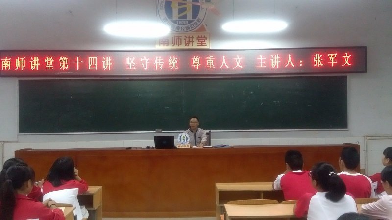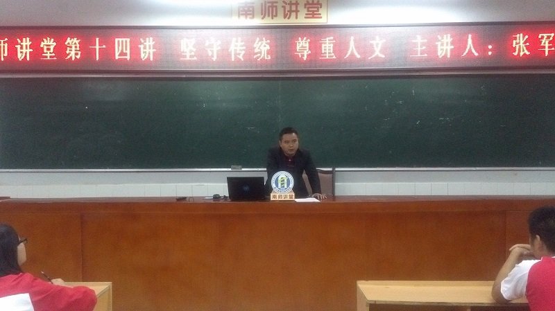 15日晚19:00,“南师讲堂”第十四讲在我校职教楼学术厅正式开讲。四川省青年知名书法家、南充市书法家协会副主席张军文先生应邀在我校作了题为“坚守传统 尊重人文”学术讲座。本次讲座由我校科研处副主任李加永主持,我校书画篆刻协会全体成员及全校书画爱好者到场聆听。