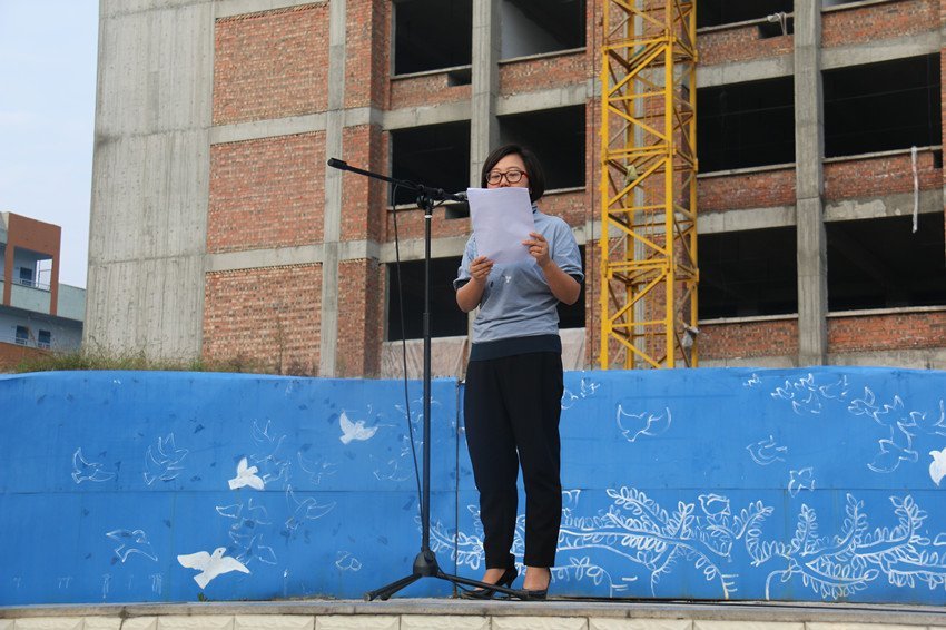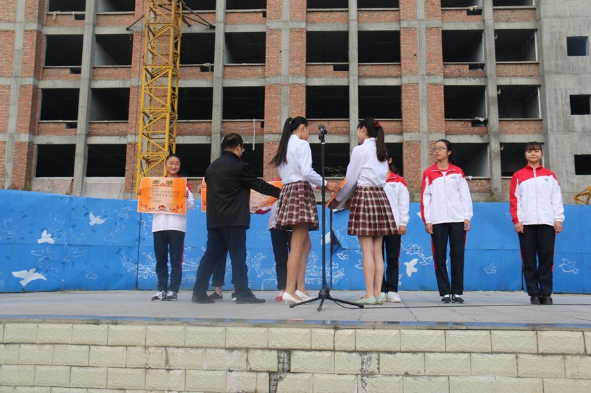 最后由校团委张姝书记宣布获奖文件:1、由我校音乐组唐民组长指导的原创节目表演唱《数蛤蟆》、舞蹈《手机》、童话剧《蚂蚁丁丁》继参加西华师范大学学前教育首届高峰论坛及四川省第八届艺术节展演获得好评之后参加南充市文艺汇演,在参赛的近80件作品中,分别获得第三名、第四名、第五名,均获得二等奖的优异成绩;2、由我校语文组青年教师曾理指导的11级2班杨忠祥同学所作影评文章“《亮剑》小评”在全市中小学生征集微电影及影评文章活动中脱颖而出,荣获二等奖;3、在共青团中央2014年举办的 “向上·向善”中国青少年书法美术大赛中,我校师生积极投稿,在所投十余份作品中七份获得奖项:陈建东老师荣获“青年组书法三等奖 ”、杨松国、郎栩瑶、傅强、荣晓、韦金五名学生获得“青年组书法优秀奖”; 4、在四川省首届川东北片区篆刻艺术作品展中我校四名师生分别获得入展奖,他们分别是:教师陈建东、学生王啟林、杨松国、冯鹏。