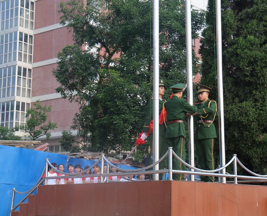 在全校师生的注目下,英姿飒爽的国旗班战士踏着整齐的步伐,护送鲜艳的五星红旗入场。伴随着庄严嘹亮的国歌声,五星红旗冉冉升起,全体师生怀着崇高的敬意凝视着随风飘扬的五星红旗,朝会第一项升旗仪式完成。