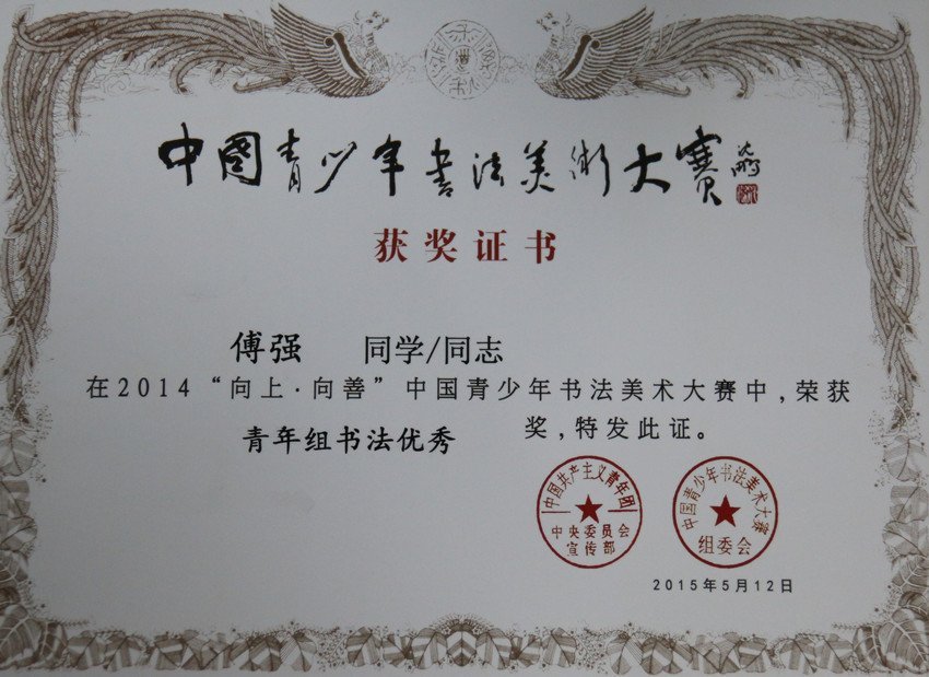 我校傅强同学荣获“向上·向善”中国青少年书法美术大赛青年组书法优秀奖