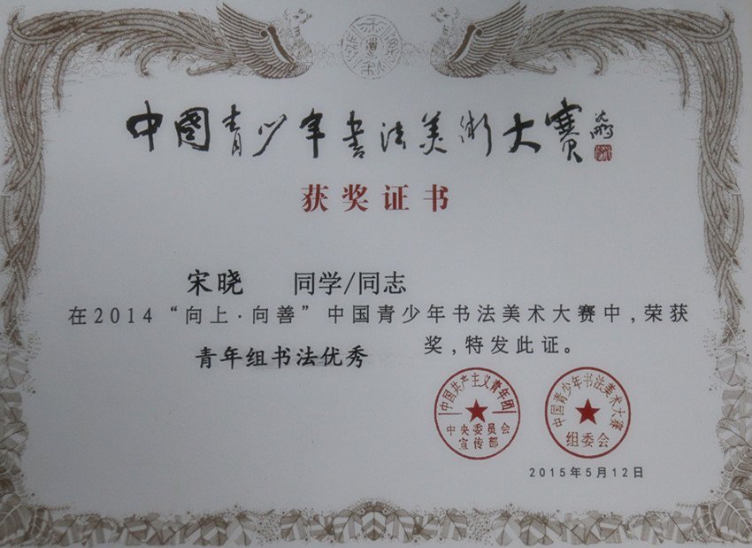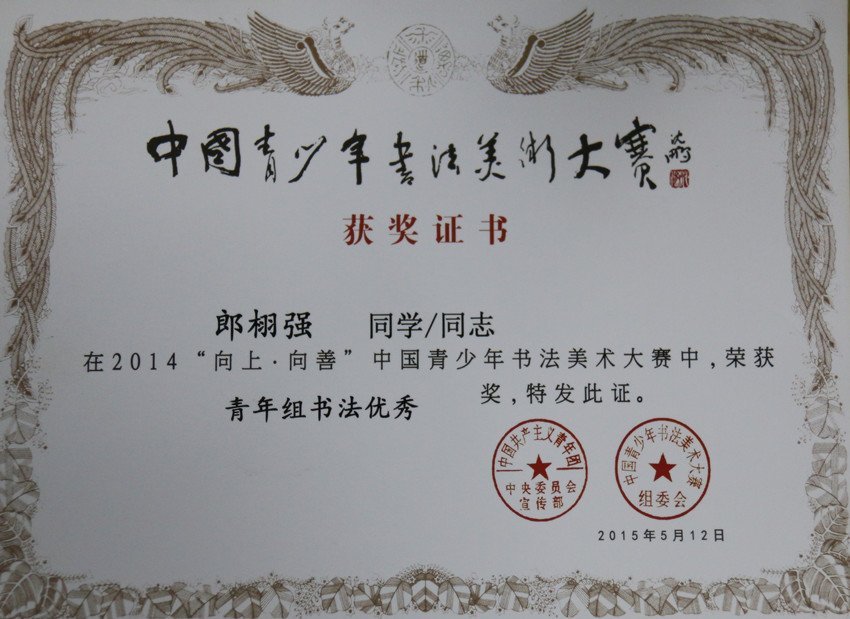 2014年我校参与中共团中央《向上·向善》中国青少年书法美术大赛,历经一年之余的层层筛选、比赛,我校书法教师陈建东荣获青年组三等奖,宋晓、朗栩瑶、朱金、冯鹏、傅强、朱金6名同学荣获“青年组书法优秀奖”。