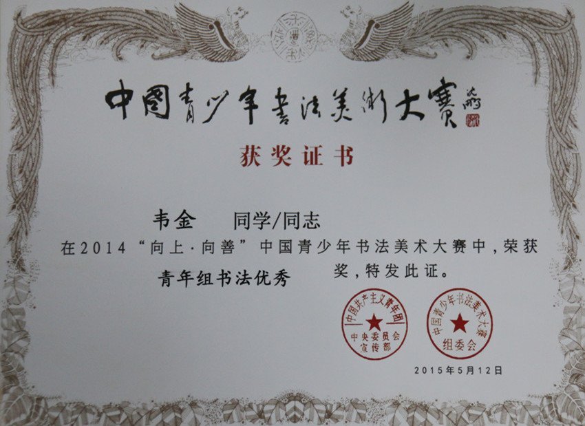 我校韦金同学荣获“向上·向善”中国青少年书法美术大赛青年组书法优秀奖