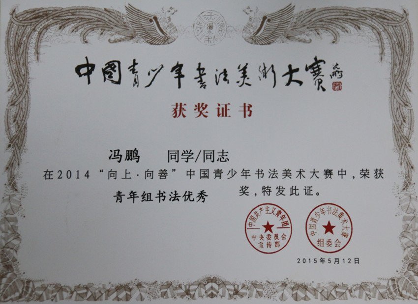 我校冯鹏同学荣获“向上·向善”中国青少年书法美术大赛青年组书法优秀奖