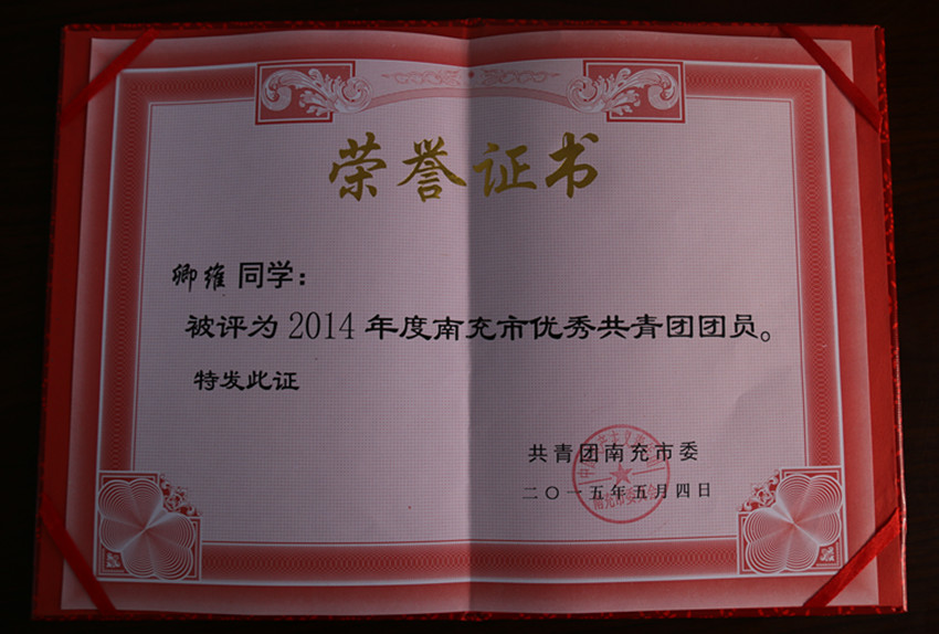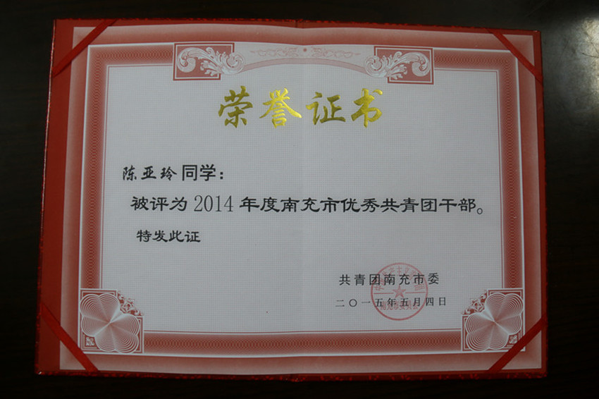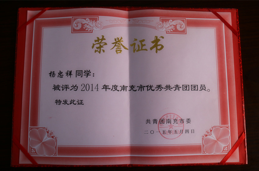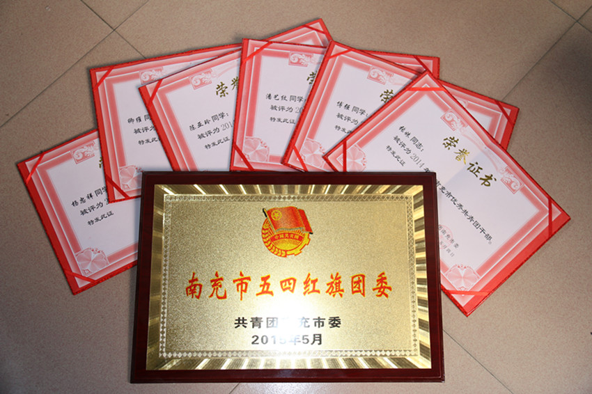 近日,根据南团发【2015】3号文件精神,激励团员青年积极踊跃的投身于南充新一轮改革发展的伟大实践,在思想上引领、在素质上拓展、在校园文化上注重素质宣传、提升青年团员的自身建设,我校在是市“五四”各项评优中获得多项荣誉。其中,我校杨忠祥等3名同学授予“南充市优秀共青团团员”荣誉称号;张姝等3名同志授予等“南充市优秀共青团干部”荣誉称号;校团委授予“南充市五四红旗团委”荣誉称号。
