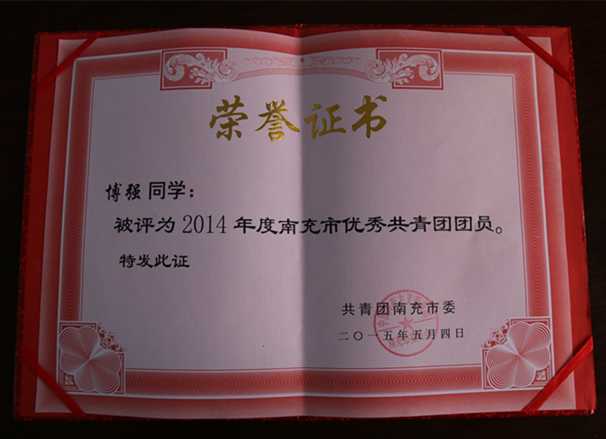 杨忠祥、傅强、卿维3名同学被授予“南充市优秀共青团团员”荣誉称号