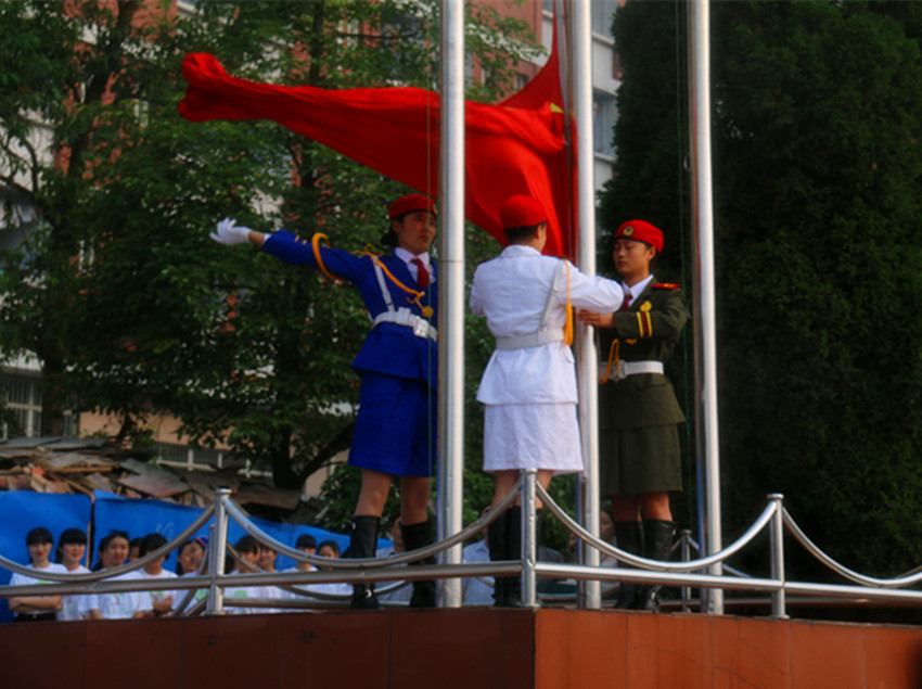 在全校师生深深地注目下,英勇矫健的女子国旗班战士踏着整齐的步伐,护送鲜艳的五星红旗入场,随着全体师生齐唱国歌,五星红旗冉冉升起,朝会第一项升旗仪式完成。