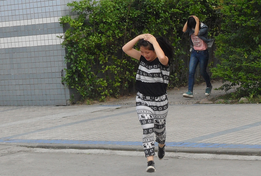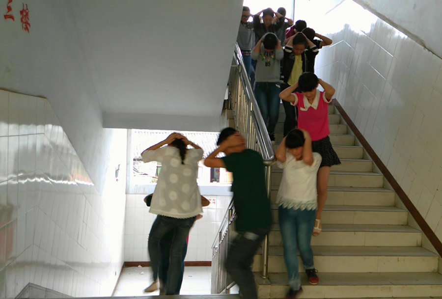 第二个阶段是星期五下午4:30分,保卫处组织护校队、消防自愿者协会和各班班长、安全委员、室长代表进行应急疏散演练,这次的重点是针对新教学楼的应急疏散。