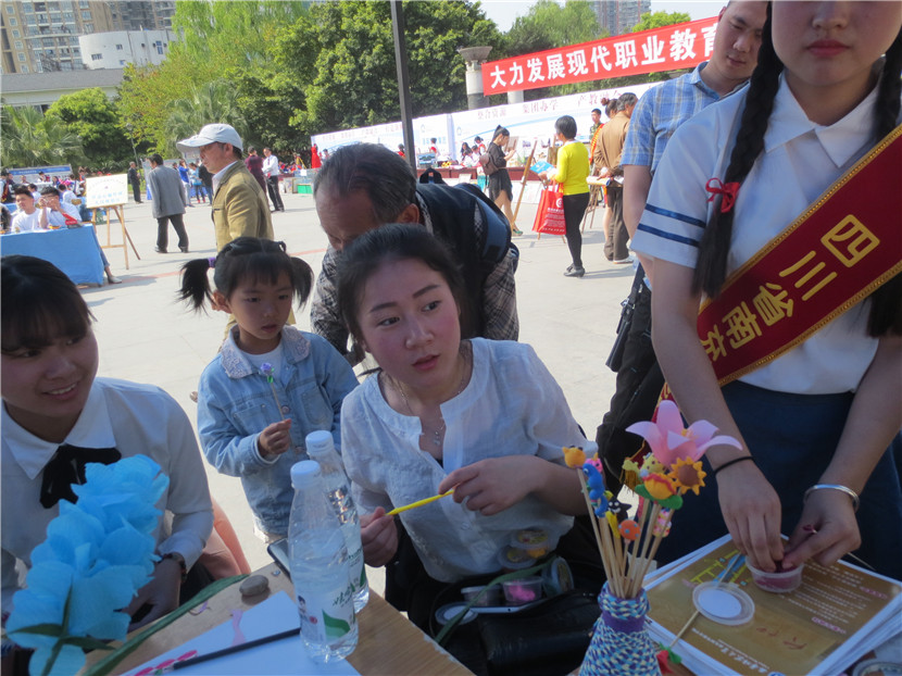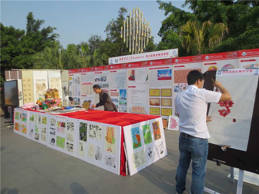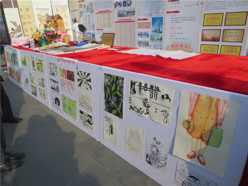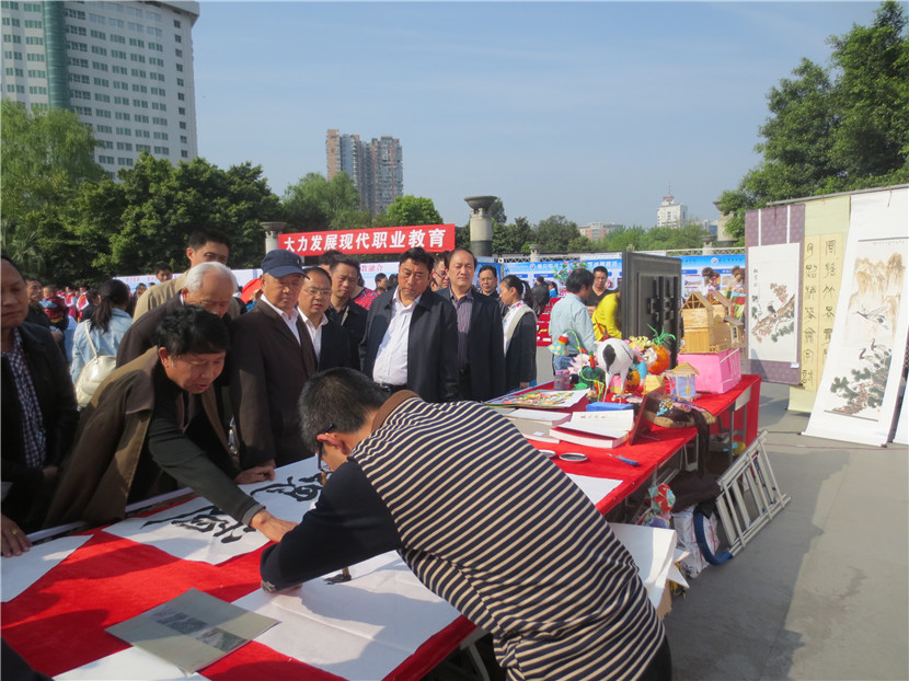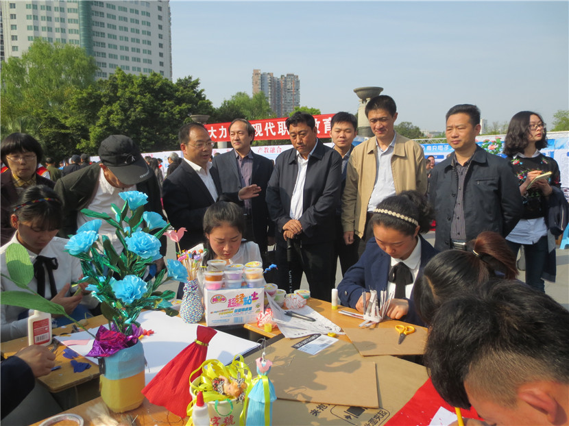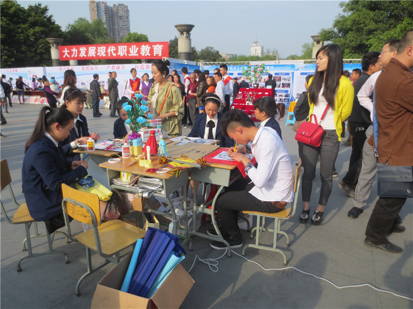 4月14日,我校组织23名学生、15名教师参加了南充市教育局主办的“职业教育成果展示”活动,学校党委领导亲自带队。当日,共有16所学校参展,声势浩大,热闹非凡。我校派出的现场书法、绘画、手工制作、礼仪、教师等五支分队各显神通、表现优异,用他们精湛的技艺、独特的气场、亮眼的作品、热情的交流吸引了大批学生、家长驻足观看,还有很多市民索要作品,咨询如何到学校就读等问题,无形中给予了师生强有力的鼓励。展板、展台、展出的各类作品也是我校此次展示活动人气大增的法码,它将近年来我校职业教育的成绩、成果以最直观的形式展示在兄弟学校以及市民面前。副市长单木真、市教育局雷局长、邓局长、曹科长等都亲自前来我校展台参观,并充分肯定了我们的教育教学成果,同时还就提升学校品质、未来发展等进行了沟通交流,提了许多宝贵的建议。