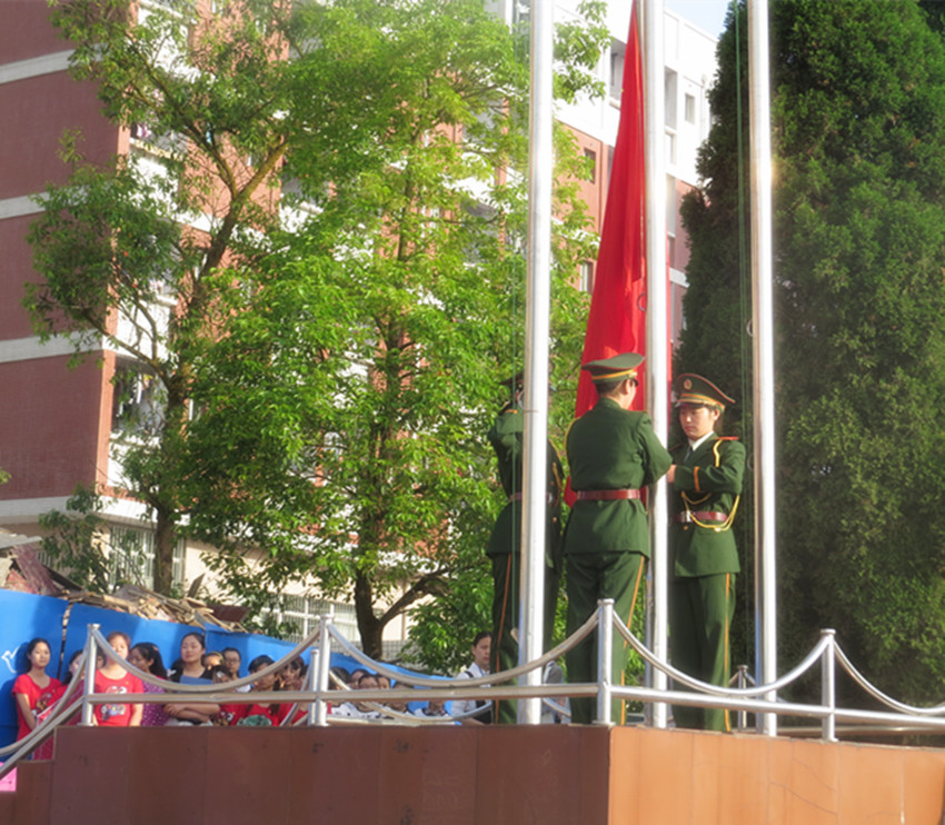 在全校师生深深地注目下,英勇矫健的国旗班战士踏着整齐的步伐,护送鲜艳的五星红旗入场,随着全体师生齐唱国歌,五星红旗冉冉升起,朝会第一项升旗仪式完成。