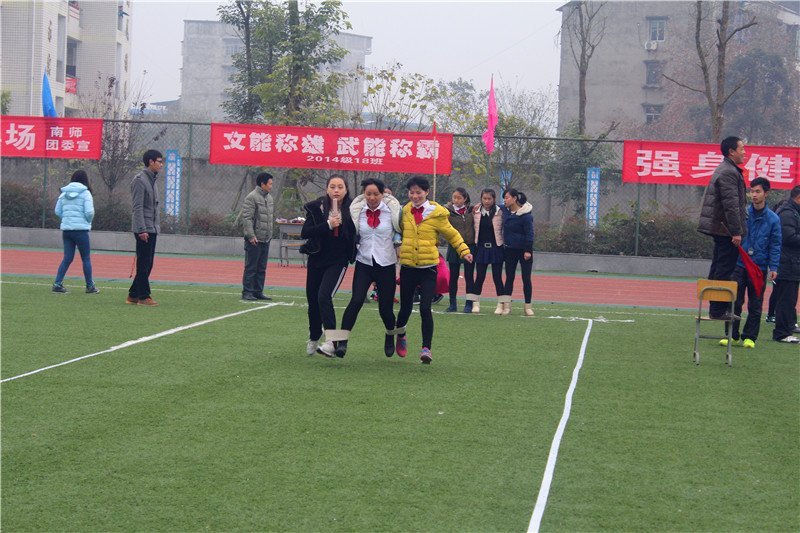 阴沉的天气掩不住同学们心中燃烧的熊熊斗志,这是运动员们在参加“三人四足”趣味体育比赛项目,只听得加油声、喝彩声、欢笑声此起彼伏!比赛需要三人一组并排,中间一位的双踝要与左右同学相邻的脚踝绑在一起,然后齐驱跑步接力。高难度的团队协作项目没有难倒我们的参赛队员,虽然绑住了脚踝,但也绑住了人心,在全体师生的注目下,他们凝神聚力,飞奔在跑道上,把“三人四足”的趣味体现得淋漓尽致。