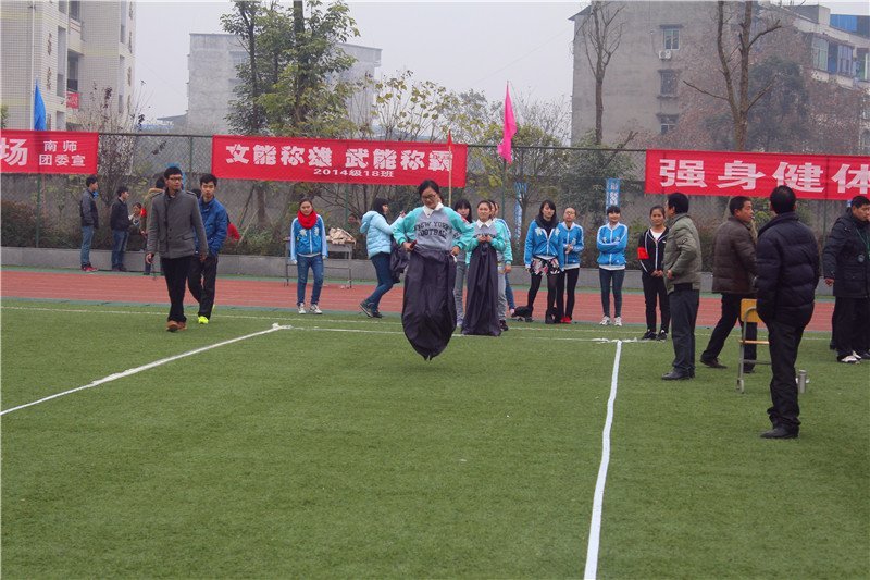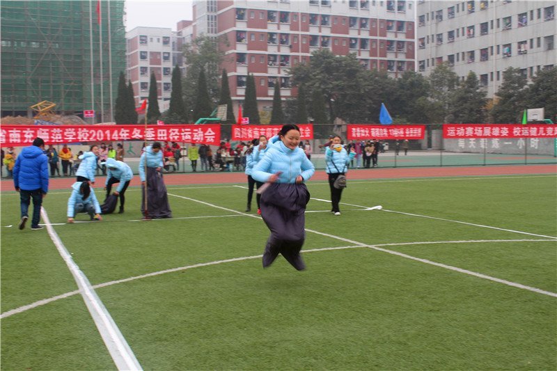 趣味十足的“袋鼠跳”着实让全体师生开了眼界、开了心怀。这是一项接力比赛,但参赛队员要用一个及腰的袋子套住双腿,跳着到达对面,而且过程中袋子还不能掉落,所以我们看到,队员们一手提头腰间的袋子,另一只手拿着接力棒,跳起来真的就是一个个活脱脱的小“袋鼠”,那形象简直惟妙惟肖,逗得大家开怀大笑。