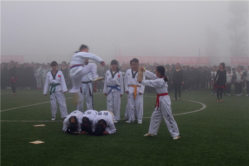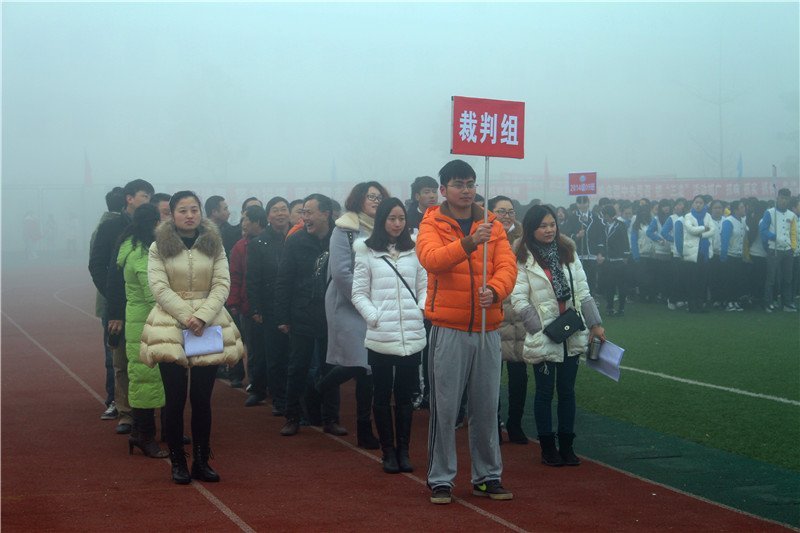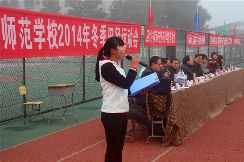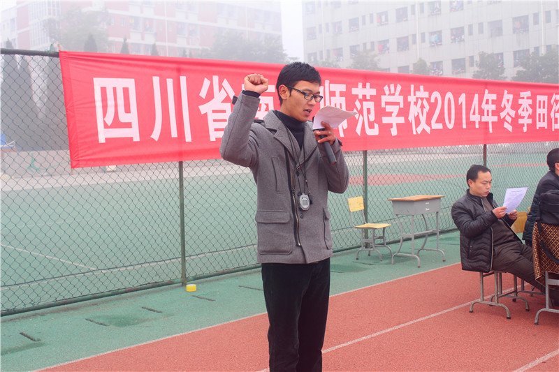随后,裁判员代表姜凯元和运动员代表分别庄严宣誓。最后李校长宣布:四川省南充师范学校2014年冬季田径运动会开幕!