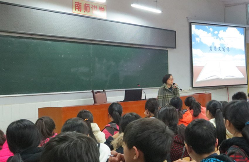 2014年11月27日晚7:30—8:30,南师团委在职教楼学术厅开展了"应用文规范写作"专题讲座。本次讲座特邀我校语文组教师、清风文学社指导老师曾理担任主讲。全体团委干部,各社团负责人,清风文学社全体成员,各团支部(团支书、宣传委员)听取讲座。