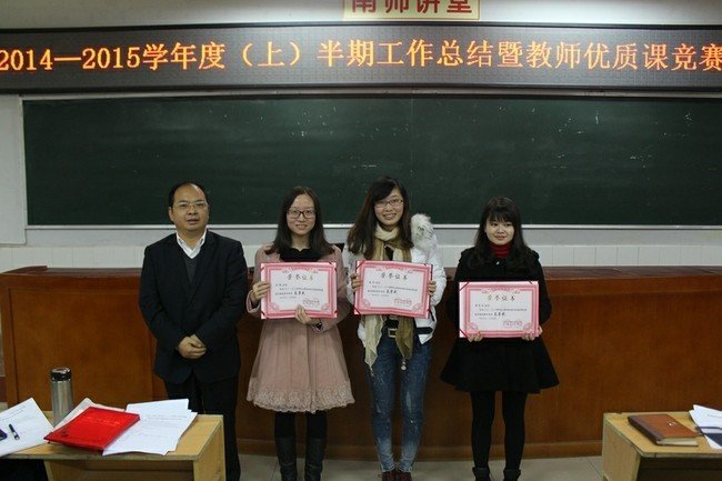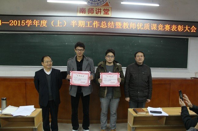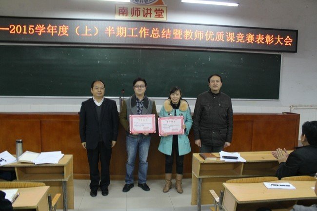 蔡礼儒校长和李长江副校长与获得优质课竞赛二等奖的教师合影