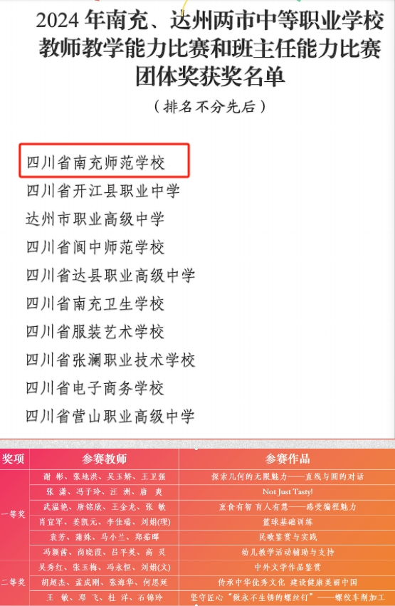 2024年南充、达州两市中等职业学校教师教学能力比赛成绩揭晓,我校教师披荆斩棘,喜获佳绩——选推9个教学参赛团队全部获奖!分别荣获一等奖6个,二等奖3个,团体奖1个,充分展现了我校教师的风采。