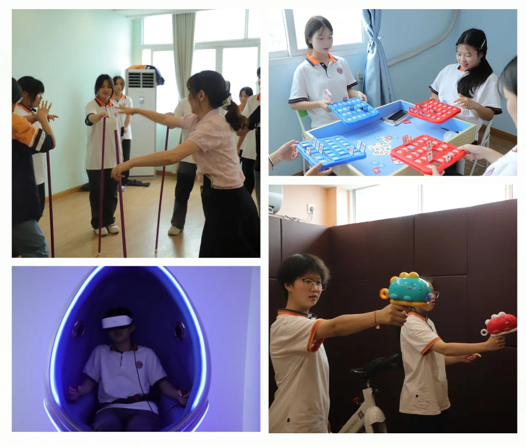 在学生心理健康成长中心,心理健康教师潘谋成、高灵带领留校同学,在宣泄室、沙盘室、音乐放松室等地方,进行趣味心灵减压拓展活动,尽情释放自己在学习、生活中的压力。