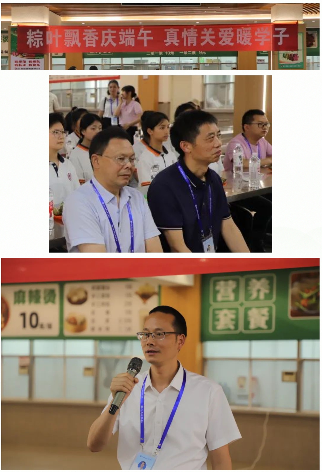 食堂里,伍银峰代表学校向留校学生致以节日的问候,表达了在端午传统佳节到来之际的美好祝愿。他叮嘱大家要注意假期安全,在学校安心学习、安心生活,迎接愉快、充实而平安的假期。